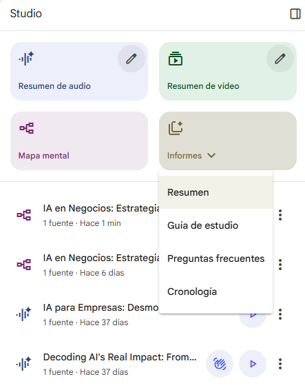 Informes: en la sección de informes le podrás pedir a Notebook LM que te genere un resumen o guía de estudio sobre el tema. Y también una cronología y preguntas frecuentes. ¡Muy interesante para estudiantes que necesitan aprender mucho en poco tiempo y de forma práctica!