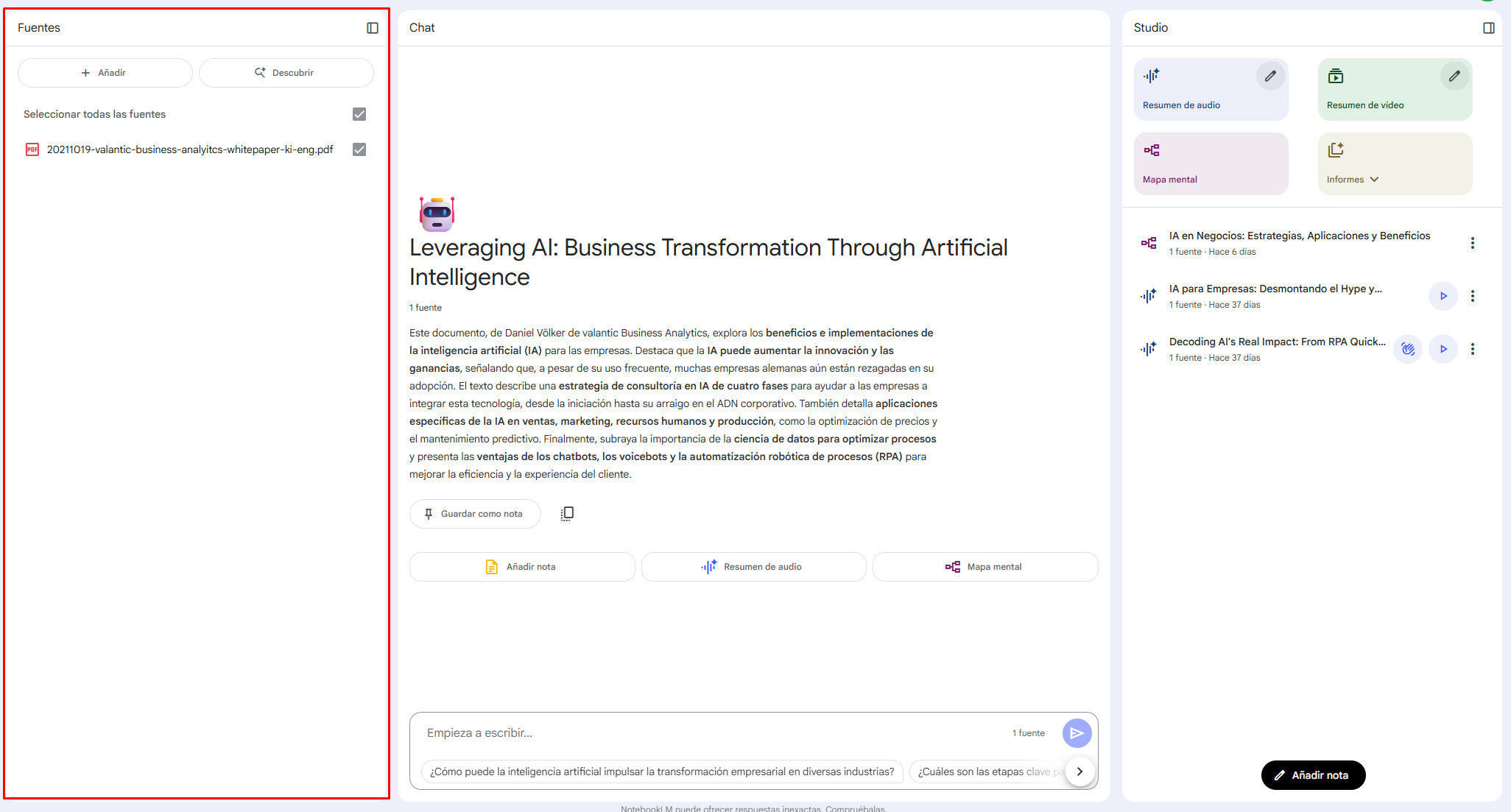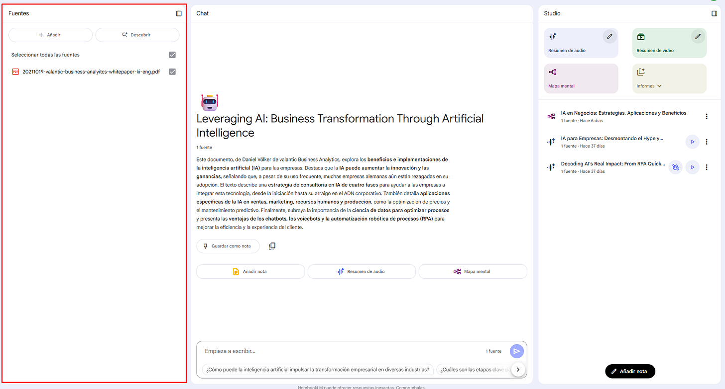Sección de fuentes: está a la izquierda de la pantalla y sirve para que cargues todos los archivos, enlaces, documentos, vídeos y audios que quieras que Notebook LM utilice como fuente.