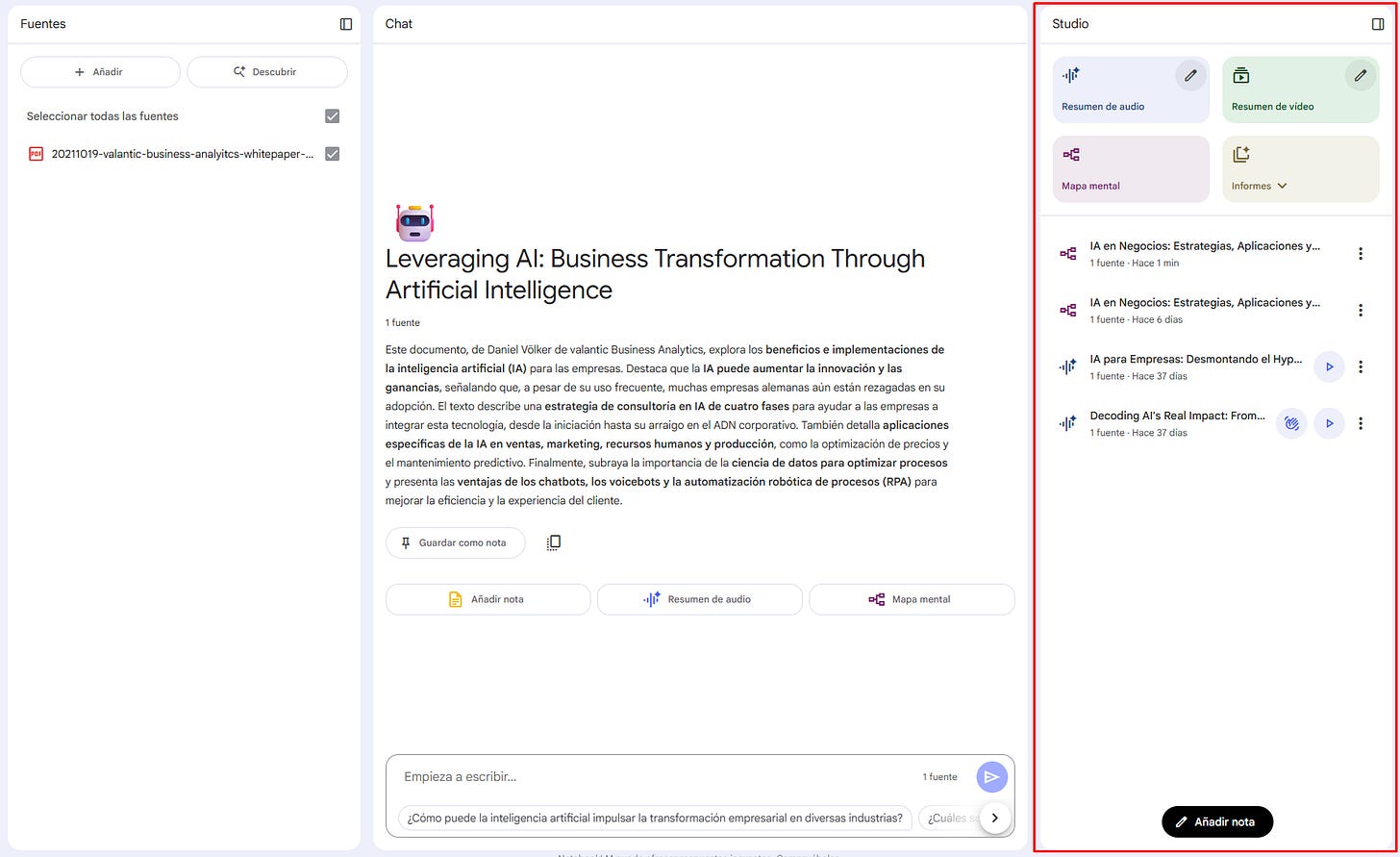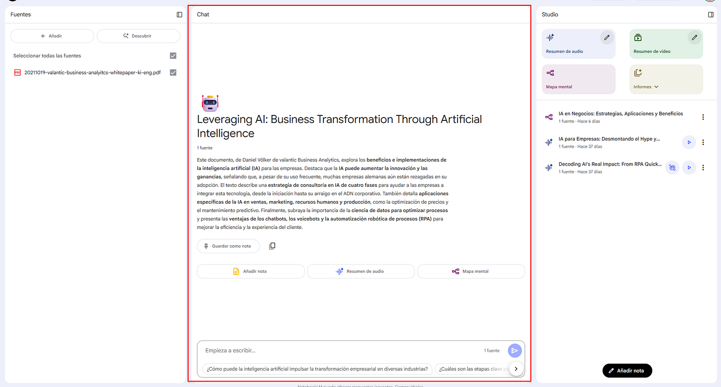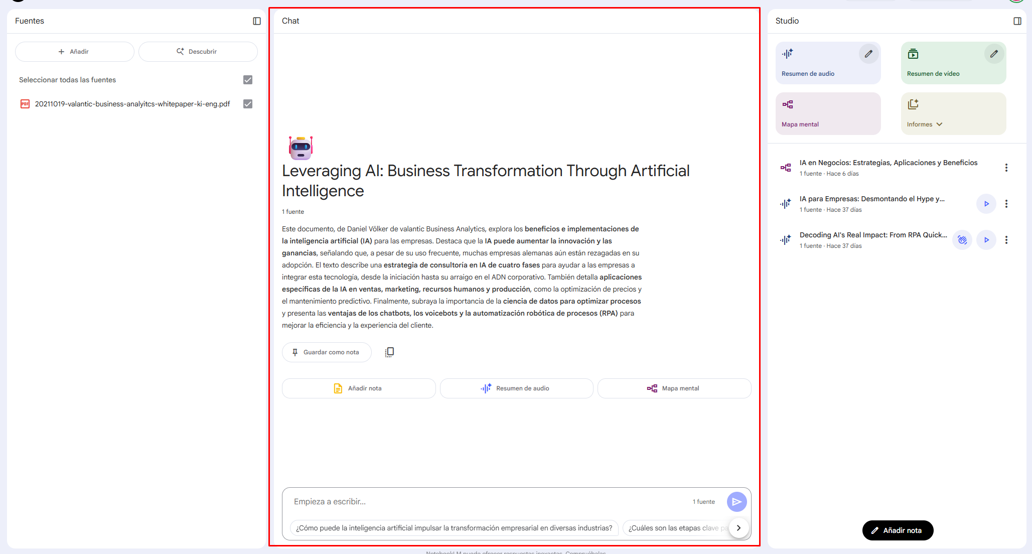 Sección de Chat: en esta sección, puedes chatear con la IA de Notebook LM y hacerle preguntas sobre una, algunas o todas las fuentes que has subido. Imagina que subes varios archivos para explorar sobre un tema, pero que solo te interesa un aspecto concreto. Puedes hacerle preguntas para que te saque solamente esa información.